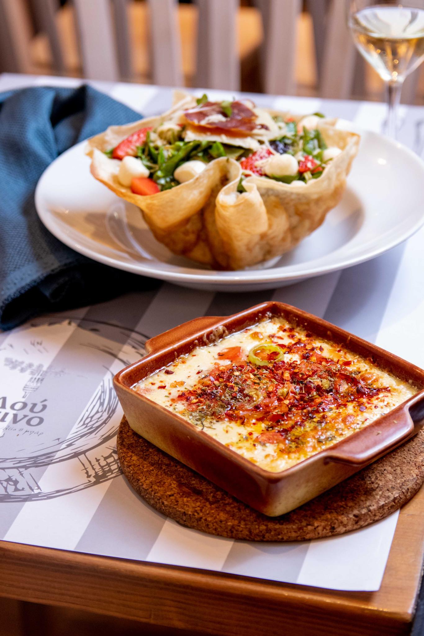 Η κουζίνα είναι επηρεασμένη από τις τοπικές γεύσεις, τη Θεσσαλονίκη και από κάποιες ευρωπαϊκές με μερικές δόσεις από την Ανατολή. Άλλωστε όπως σημειώνει ο σεφ αγαπάει την κουζίνα της Θεσσαλονίκης και επιμένει τόσο στις τοπικές γεύσεις όσο και στις μεγάλες ποσότητες που την διακρίνουν. Το μενού έχει συχνά νέες προσθήκες με τελευταία, που κατατάσσεται στα must try πιάτα, το λευκό σαγανάκι γαρίδας με μοσχολέμονο, φινόκιο και γκρεμολάτα δενδρολίβανου και σκόρδου.