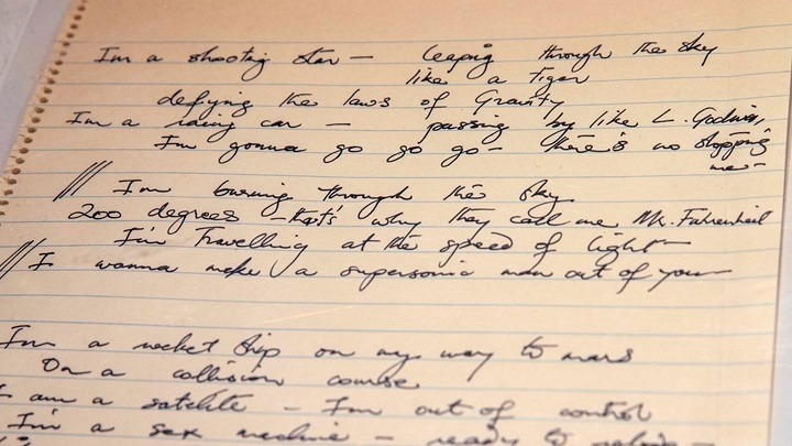 Η πίσω πλευρά της σελίδας που περιλαμβάνει στίχους του «A Kind Of Magic» ανακαλύφθηκε αφού αφαιρέθηκε από μία προθήκη στην έκθεση, αναφέρει ο οίκος δημοπρασιών.