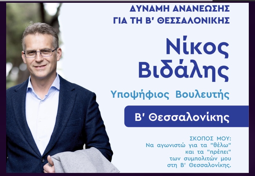 Ο Νίκος Βιδάλης δοκιμάζει για πρώτη φορά τις δυνάμεις του ως υποψήφιος βουλευτής με τη Νέα Δημοκρατία, στη Β’ εκλογική περιφέρεια Θεσσαλονίκης, στις εκλογές της 21ης Μαΐου.