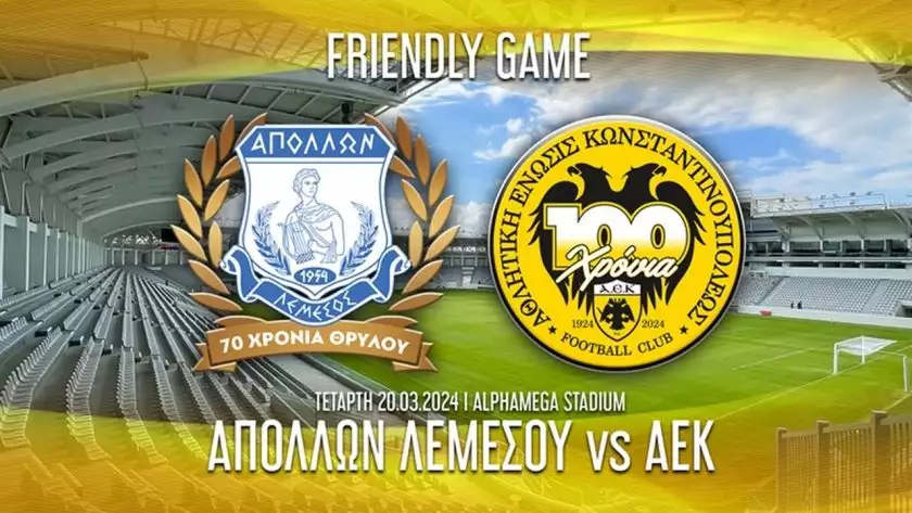 «Η ΠΑΕ ΑΕΚ ανακοινώνει ότι αποδέχθηκε με χαρά την πρόσκληση του Απόλλωνα Λεμεσού για τη διεξαγωγή φιλικού αγώνα στο πλαίσιο των εορτασμών για τη συμπλήρωση των 70 χρόνων του κυπριακού συλλόγου.
