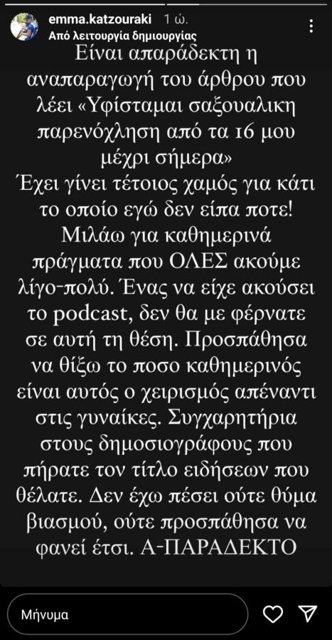 H Εμμανουέλα Κατζουράκη απαντάει στα προσωπικά της social media για την είδηση που κυκλοφορεί τις τελευταίες ώρες αναφορικά με τα περιστατικά σεξουαλικής παρενόχλησης που έχει βιώσει.