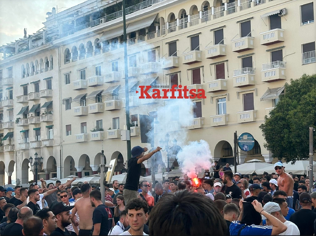 Οι χιλιαδες φίλαθλοι του Ηρακλή φωνάζουν «ΗΡΑ για σένα δεν μας έμεινε μυαλό» ενώ έχουν κατακλύσει το κέντρο με πυρσούς και κόρνες.