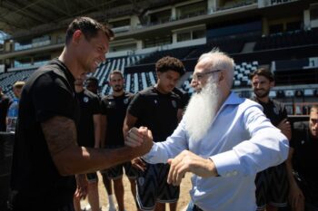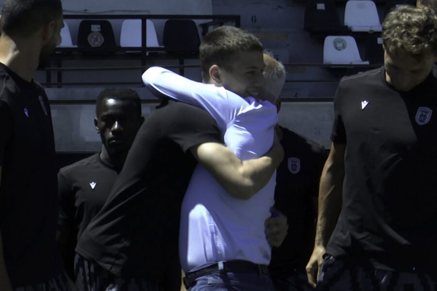 Οι εντυπωσιακές εικόνες ξεκίνησαν όταν προσγειώθηκε με το ιδιωτικό του ελικόπτερο απευθείας στο γήπεδο της Τούμπας λίγο μετά τις 14:30. Η υποδοχή, θερμή και συναισθηματική, ξεχώρισε όταν ο Ραζβάν Λουτσέσκου βρέθηκε στην αγκαλιά του ιδιοκτήτη, συνοδευόμενος από τους παίκτες και τα στελέχη της ομάδας – η ΠΑΕ χαρακτήρισε τη σκηνή ως «οικογένεια».