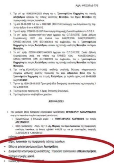 Απόσπασμα της άδειας που δόθηκε για την «πρόχειρη» και προσωρινή εγκατάσταση με τον ακριβή αριθμό της δυναμικότητάς της