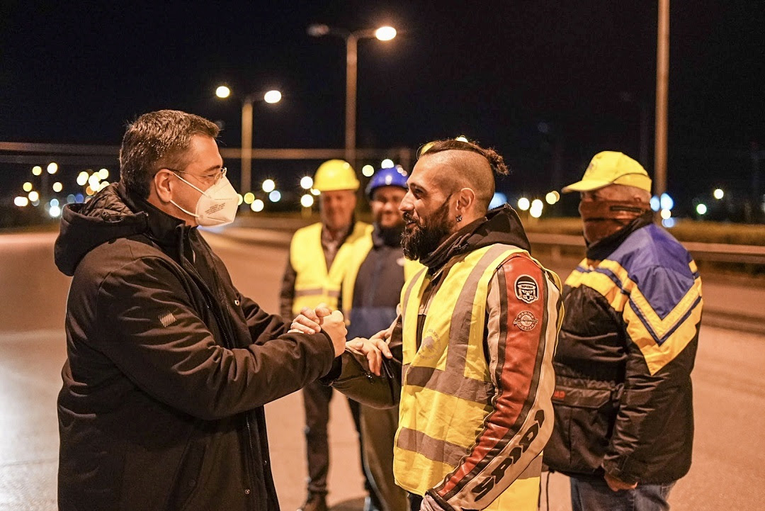 Συνοδευόμενος από τον Αντιπεριφερειάρχη Υποδομών και Δικτύων Πάρη Μπίλλια, ο κ. Τζιτζικώστας επέβλεψε την πορεία των εργασιών και συνομίλησε με τους εργαζόμενους στα συνεργεία για τα οφέλη της νυχτερινής υλοποίησης της ασφαλτόστρωσης.