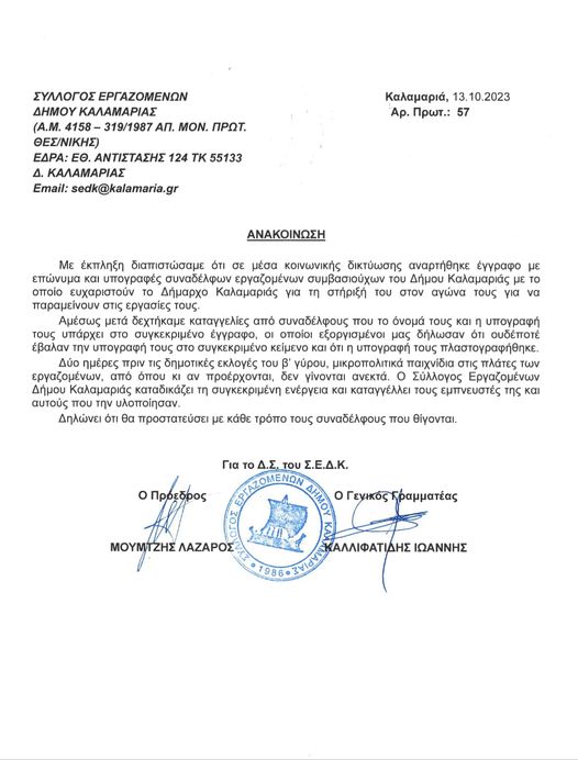 Όπως αναφέρει, εργαζόμενοι συμβασιούχοι κατήγγειλαν την ύπαρξη του ονόματός τους σε λίστα προσώπων που στηρίζουν τον κ. Δαρδαμανέλη αλλά και την πλαστογράφηση των υπογραφών τους!