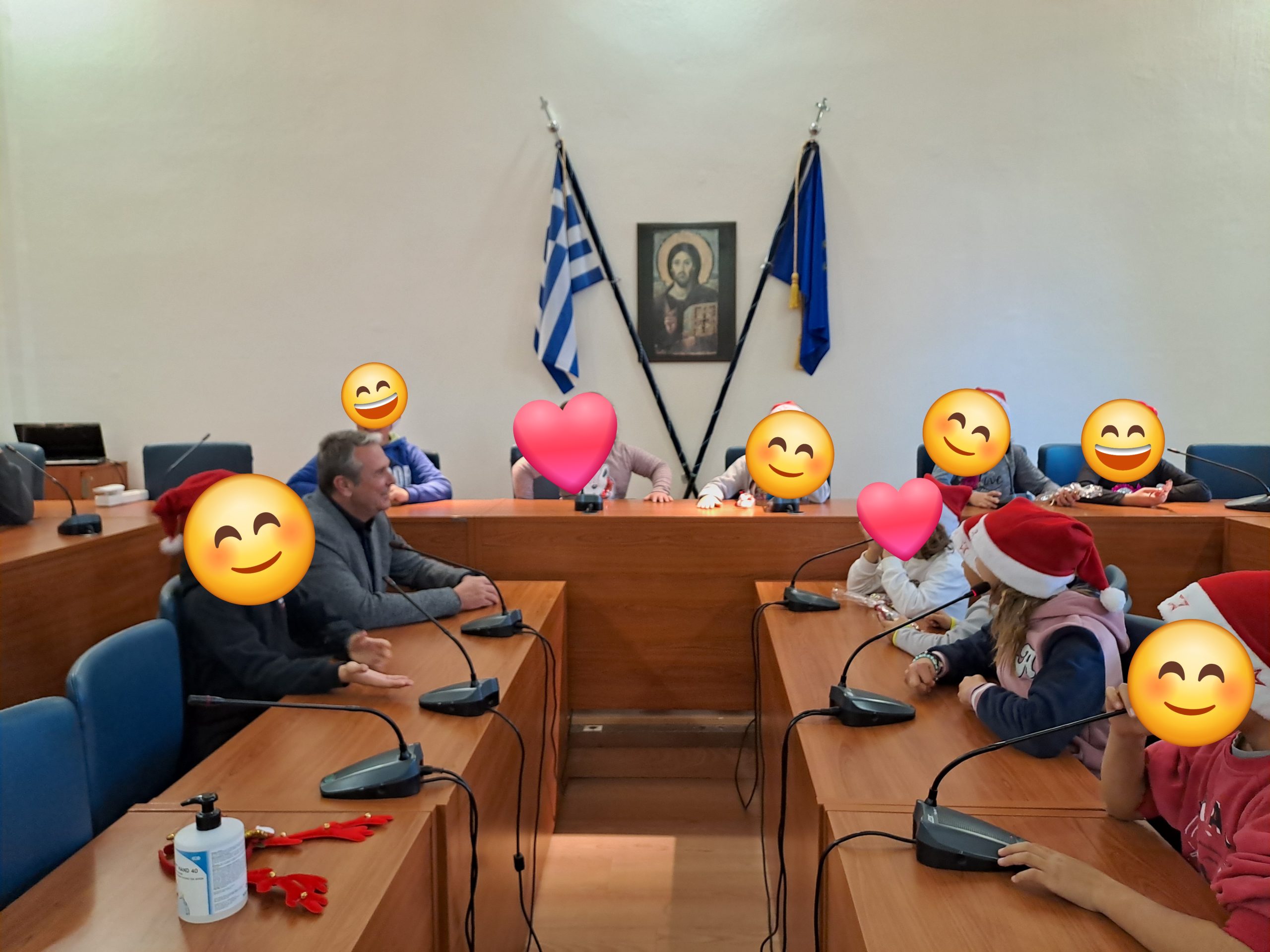 Τους μαθητές υποδέχτηκε ο Δήμαρχος, Γιώργος Εμμανουήλ, στην αίθουσα του Δημοτικού Συμβουλίου, όπου είχε στηθεί το χριστουγεννιάτικο δέντρο, το οποίο στόλισαν όλοι μαζί!
