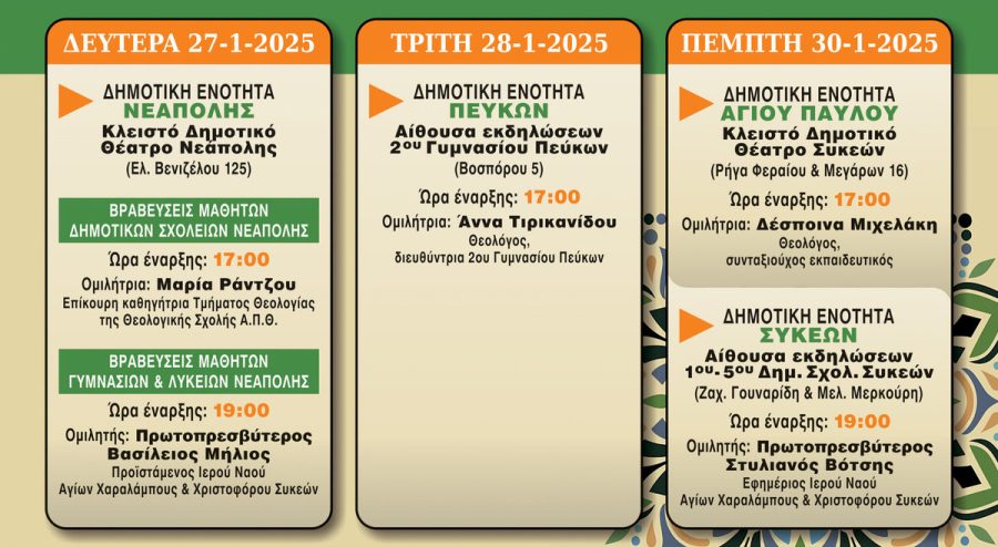 Παράλληλα και με αφορμή την ημέρα που είναι αφιερωμένη στους προστάτες των γραμμάτων μετά τις ομιλίες, ο δήμος θα βραβεύσει τους αριστούχους μαθητές όλων των σχολείων σε Συκιές, Νεάπολη, Άγιο Παύλο και Πεύκα.
