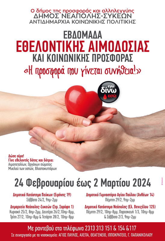 Υπενθυμίζεται ότι η πρώτη για το 2024, τακτική Εβδομάδα Εθελοντικής Αιμοδοσίας και Κοινωνικής Προσφοράς του δήμου Νεάπολης-Συκεών θα πραγματοποιηθεί από το Σάββατο 24 Φεβρουαρίου έως και το Σάββατο 2 Μαρτίου σε συνεργασία με τα δημόσια νοσοκομεία της πόλης ΑΓΙΟΣ ΠΑΥΛΟΣ, ΑΧΕΠΑ, ΘΕΑΓΕΝΕΙΟ, ΙΠΠΟΚΡΑΤΕΙΟ, Γ. ΠΑΠΑΝΙΚΟΛΑΟΥ. Τα κινητά συνεργεία αιμοληψίας των νοσοκομείων θα βρίσκονται στα Πεύκα, τις Συκιές, τη Νεάπολη και τον Άγιο Παύλο, ενώ, παράλληλα, εξειδικευμένα στελέχη φορέων, αλλά και των κοινωνικών υπηρεσιών του δήμου, θα ενημερώνουν τους προσερχόμενους αιμοδότες για τη διαδικασία και την ανάγκη να γίνουν δότες μυελού των οστών, αιμοπεταλίων, βλαστοκυττάρων, όπως και δωρητές και δωρήτριες οργάνων σώματος.