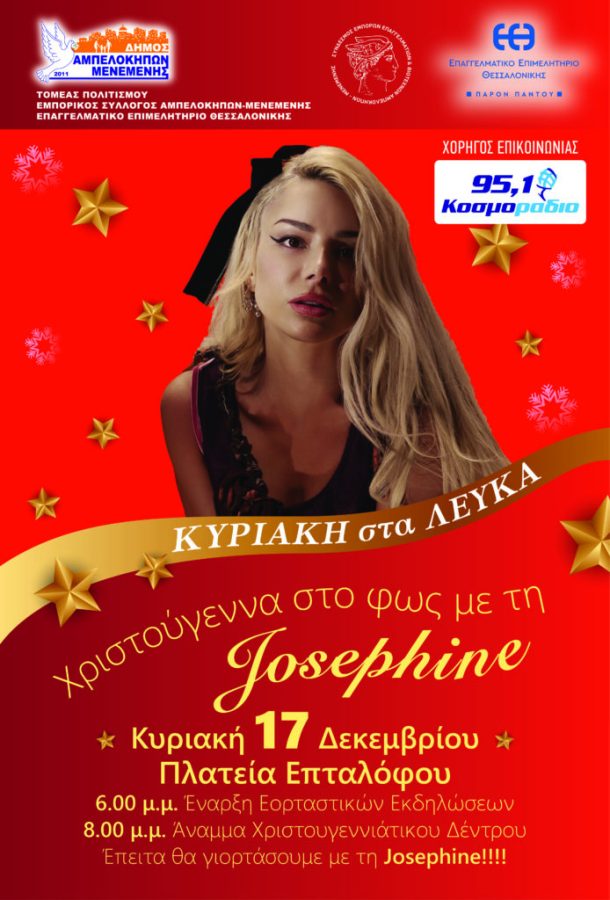 Με την παρουσία της διάσημης τραγουδίστριας Josephine θα δοθεί το έναυσμα για την έναρξη των εορταστικών εκδηλώσεων στον δήμο Αμπελοκήπων – Μενεμένης την Κυριακή 17 Δεκεμβρίου.