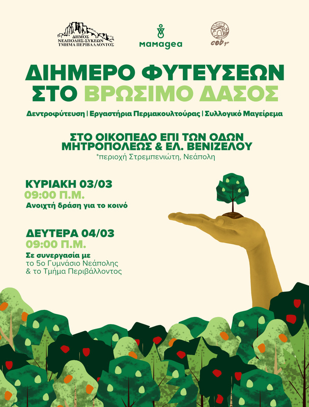 Η πρώτη Κυριακή αυτού του Μάρτη θα μείνει αξέχαστη για το δήμο Νεάπολης-Συκεών αφού θα είναι πράσινη και… βρώσιμη. Από τις 9 το πρωί ως τις 6 το απόγευμα θα γίνουν φυτεύσεις με τη συμμετοχή όλων όσων θέλουν να συμμετάσχουν αφού προηγηθεί ο διαχωρισμός σε ομάδες. Ενδιάμεσα θα γίνουν εργαστήρια για την περμακουλτούρα, διάλειμμα για φαγητό και η δράση θα συνεχιστεί με φυτεύσεις. Μετά την ολοκλήρωση των σταδίων συμμετοχικού σχεδιασμού, ο δήμος σε συνεργασία με τη Μαμαγαία και το Cob.gr καλούν τους δημότες αλλά και όλους τους πολίτες της Θεσσαλονίκης να συμμετάσχουν στην κυριακάτικη… σπορά.