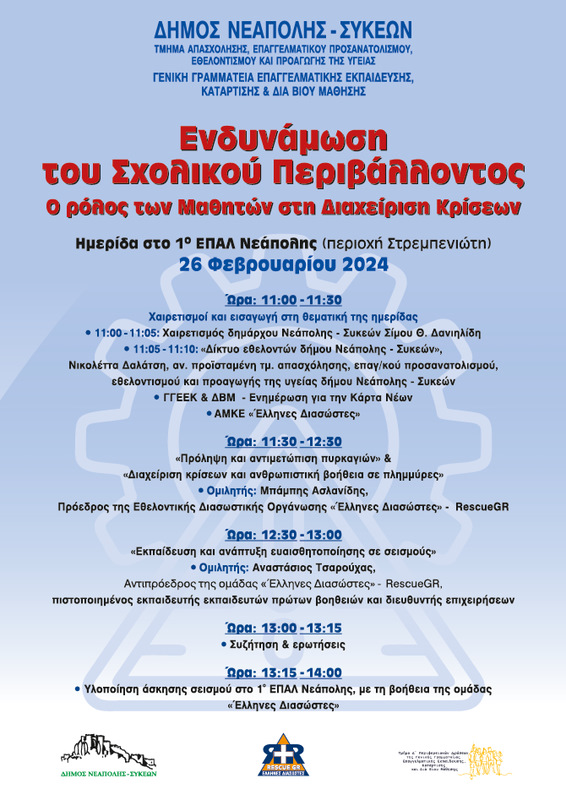 Με το σκεπτικό αυτό και με στόχο την ενδυνάμωση του σχολικού περιβάλλοντος η Γενική Γραμματεία Επαγγελματικής Εκπαίδευσης Κατάρτισης και Δια Βίου Μάθησης και το τμήμα Απασχόλησης, Επαγγελματικού προσανατολισμού, Εθελοντισμού και Προαγωγής της υγείας του δήμου Νεάπολης- Συκεών διοργανώνουν ημερίδα για το ρόλο των μαθητών στη διαχείριση κρίσεων.