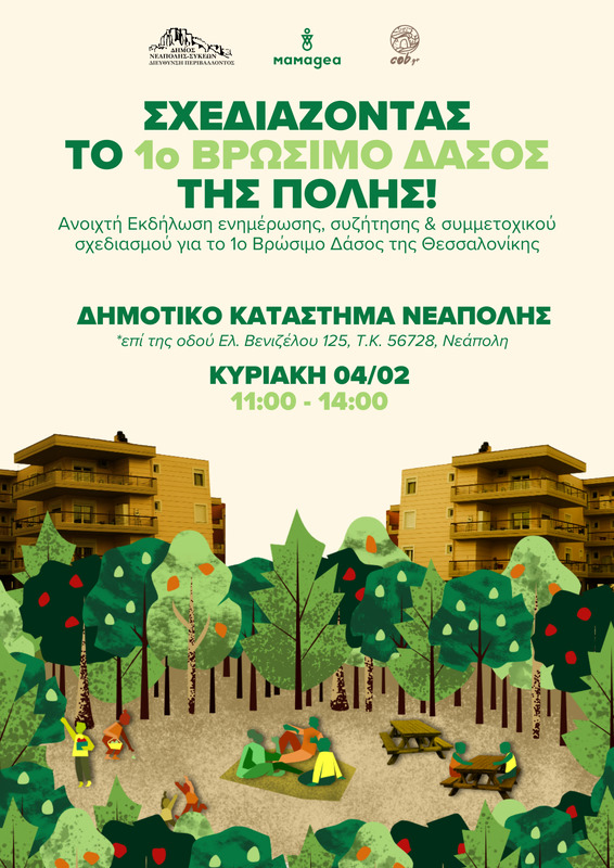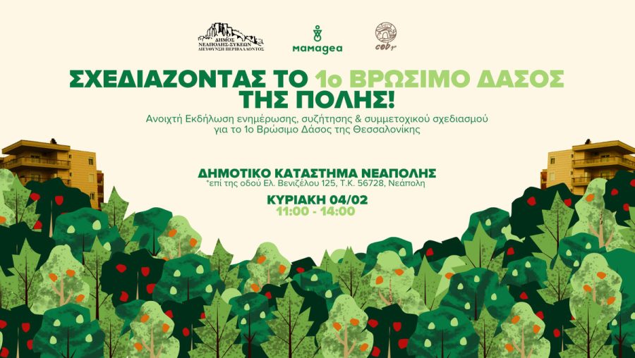 Η πρώτη Κυριακή του Φεβρουαρίου είναι αφιερωμένη στο περιβάλλον και στην αλληλεπίδρασή μας με αυτό. Ο δήμος Νεάπολης-Συκεών σε συνεργασία με την Περιβαλλοντική Οργάνωση Μαμαγαία ετοιμάζουν ένα αστικό βρώσιμο δάσος και οργανώνουν μία ανοιχτή ενημερωτική δράση προκειμένου να ενημερωθούν όλες και όλοι συμμετέχοντας σε μια ξεχωριστή «πράσινη» εμπειρία.