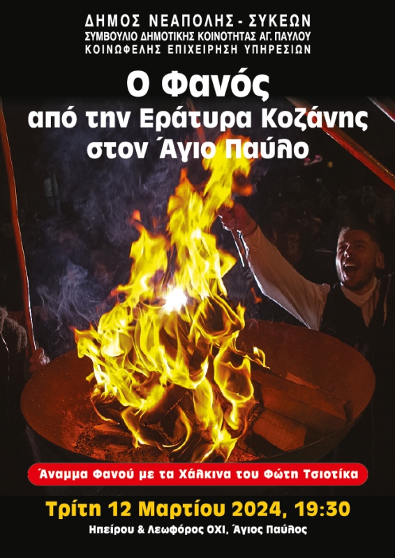 Το άναμμα του Φανού θα γίνει στις 7.30 το απόγευμα στη συμβολή της λεωφόρου Όχι με την οδό Ηπείρου. Εκεί ο δήμος Νεάπολης-Συκεών και συγκεκριμένα η Κοινωφελής Επιχείρηση Υπηρεσιών του δήμου (ΚΕΥΝΣ) σε συνεργασία με το Τοπικό Συμβούλιο του Αγίου Παύλου έχει καλέσει για πρώτη φορά τα Χάλκινα του Φώτη Τσιοτίκα για να συνοδεύσουν μουσικά το άναμμα του Φανού από την Εράτυρα Κοζάνης.