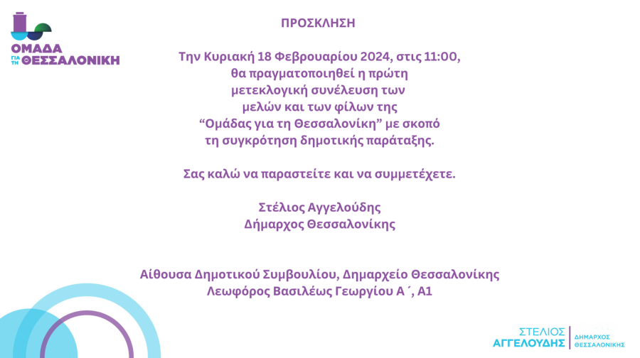 Τη Κυριακή 18 του Φλεβάρη θα πραγματοποιηθεί η πρώτη μετεκλογική συνέλευση φίλων και μελών της «Ομάδας για τη Θεσσαλονίκη» του Στέλιου Αγγελούδη, με σκοπό την συγκρότηση δημοτικής παράταξης