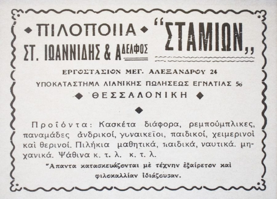 Όταν ξεκινήσαμε, ο πληθυσμός της Θεσσαλονίκης ήταν ένα εθνολογικό πάζλ. Ανάμεσα στα τούρκικα φέσια, στα ευρωπαϊκά ημίψηλα και στα εβραϊκά «κιπά», ως αμιγώς ελληνικά ξεχώριζαν το ναυτικό, το ψαράδικο καθώς και το αγροτικό καπέλο. Μετέπειτα φοριόταν η τραγιάσκα και το περίφημο καβουράκι. Χωρίς υπερβολή, όλοι φορούσαν τραγιάσκα κατασκευής «Σταμίων».