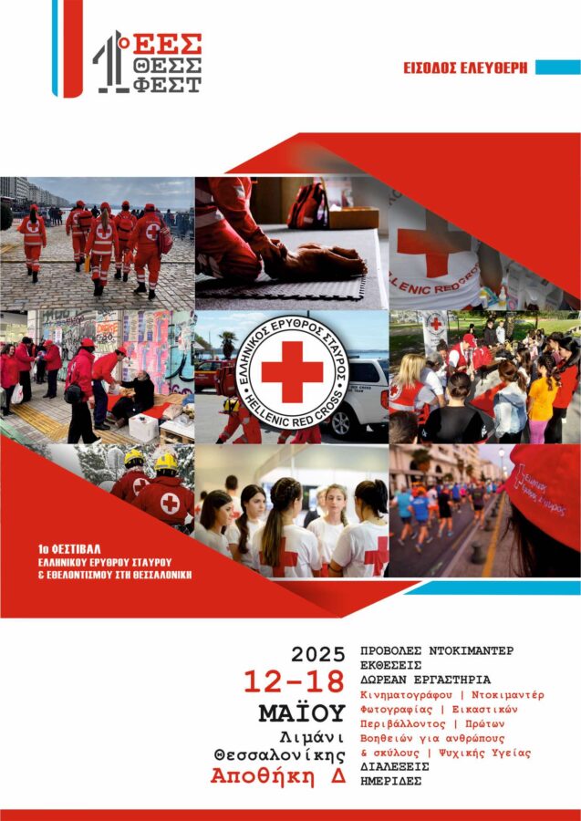Το Περιφερειακό Τμήμα του Ελληνικού Ερυθρού Σταυρού στη Θεσσαλονίκη, με γνώμονα την ευαισθητοποίηση των πολιτών σε θέματα που αφορούν τον Ερυθρό Σταυρό, τον εθελοντισμό, την προστασία του περιβάλλοντος, καθώς και την αντιμετώπιση καταστροφών, διοργανώνει το 1ο Φεστιβάλ Ελληνικού Ερυθρού Σταυρού και Εθελοντισμού. Το Φεστιβάλ θα πραγματοποιηθεί από 12 έως 18 Μαΐου 2025 στην «Αποθήκη Δ’» στο Λιμάνι της Θεσσαλονίκης.