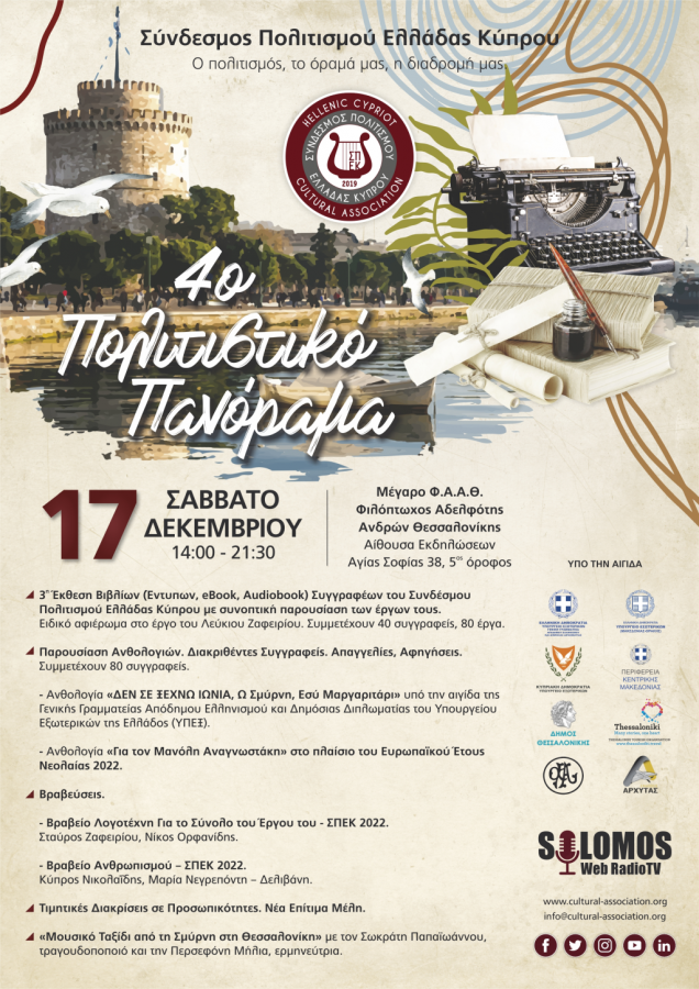 Το 4ο Πολιτιστικό Πανόραμα του Συνδέσμου Πολιτισμού Ελλάδας Κύπρου πραγματοποιείται υπό την αιγίδα της Γενικής Γραμματείας Απόδημου Ελληνισμού και Δημόσιας Διπλωματίας του Υπουργείου Εξωτερικών της Ελλάδος, του Υπουργείου Εσωτερικών – Τομέας Μακεδονίας Θράκης, της Περιφέρειας Κεντρικής Μακεδονίας, του Δήμου Θεσσαλονίκης και του Οργανισμού Τουρισμού Θεσσαλονίκης, σε συνεργασία με τον εκδοτικό οργανισμό Αρχύτας. Λήξη εκδήλωσης 21:30.