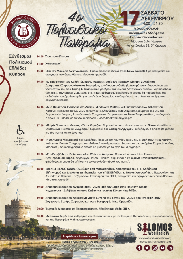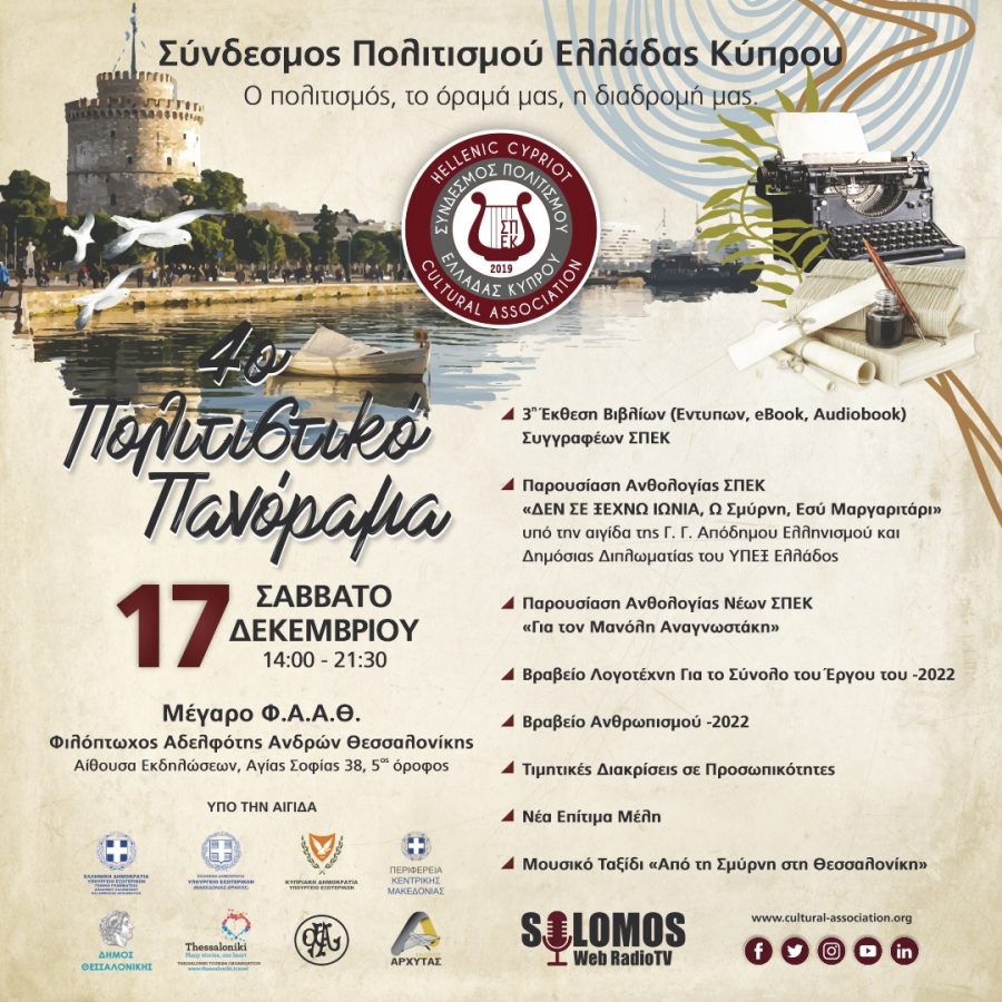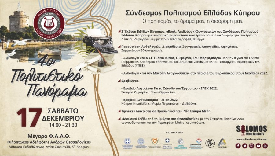 Το Σάββατο 17 Δεκεμβρίου 2022, στις 14:00 ώρα Ελλάδος, για τέταρτη συνεχή χρονιά, λαμβάνει χώρα η ετήσια, καθιερωμένη εκδήλωση του Συνδέσμου Πολιτισμού Ελλάδας Κύπρου στο Μέγαρο Φ.Α.Α.Θ., στην αίθουσα εκδηλώσεων του 5ου ορόφου της Φιλοπτώχου Αδελφότητος Ανδρών Θεσσαλονίκης, επί της οδού Αγίας Σοφίας 38, στο κέντρο της Θεσσαλονίκης.