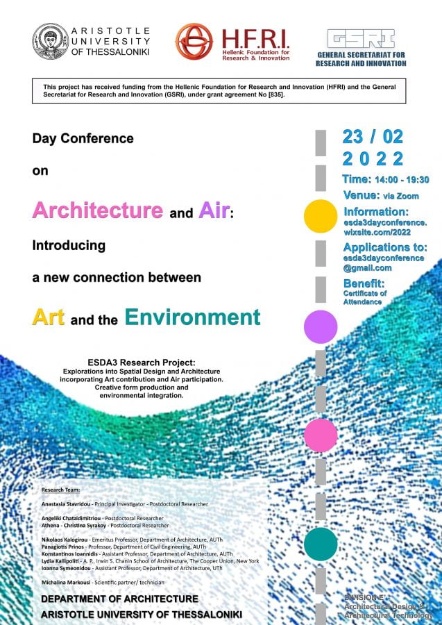 Στην Ημερίδα θα παρουσιαστούν αποτελέσματα του ερευνητικού έργου «Διερευνήσεις στον χωρικό σχεδιασμό και την αρχιτεκτονική συμπεριλαμβάνοντας τη συνεισφορά της τέχνης και τη συμμετοχή του αέρα. Δημιουργική παραγωγή μορφών και περιβαλλοντική ενσωμάτωση» το οποίο υλοποιείται από την ερευνητική ομάδα ESDA3 στο Τμήμα Αρχιτεκτόνων Μηχανικών του ΑΠΘ και ολοκληρώνεται τον Μάρτιο του 2022.