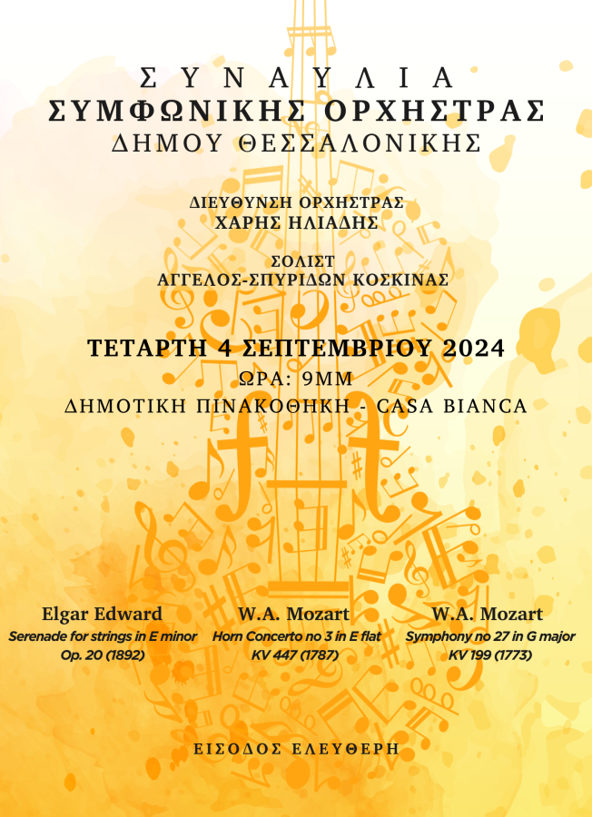 Η Συμφωνική Ορχήστρα Δήμου Θεσσαλονίκης-Thessaloniki City Symphony Orchestra, υπό τη μουσική διεύθυνση του αρχιμουσικού Χάρη Ηλιάδη, παρουσιάζει την Τετάρτη 4 Σεπτεμβρίου 2024, στη Δημοτική Πινακοθήκη, Casa Bianca, συναυλία με έργα των Edward Elgar (1857 – 1934) και W.A. Mozart (1756 – 1791).