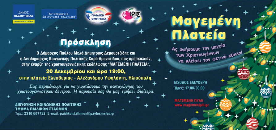 Ο Δήμος Παύλου Μελά, η Αντιδημαρχία Κοινωνικής Πολιτικής και το Τμήμα Παιδικών Σταθμών, γιορτάζουν τη λάμψη των Χριστουγέννων και σας προσκαλούν στην έναρξη της χριστουγεννιάτικης εκδήλωσης «ΜΑΓΕΜΕΝΗ ΠΛΑΤΕΙΑ», με το άναμμα του χριστουγεννιάτικου δέντρου, την Τετάρτη 20 Δεκεμβρίου και ώρα 19:00, στην Πλατεία Ελευθερίας – Αλέξανδρος Υψηλάντης στην Άνω Ηλιούπολη.