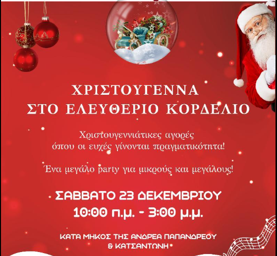 Ένα μεγάλο Χριστουγεννιάτικο party για μικρούς και μεγάλους στις δύο κεντρικές οδούς της Δημοτικής Ενότητας του Δήμου Κορδελιού Ευόσμου, οργανώνει με ξεχωριστή επιμέλεια και μεράκι, ο Εμπορικός Σύλλογος Ελευθερίου Κορδελιού.