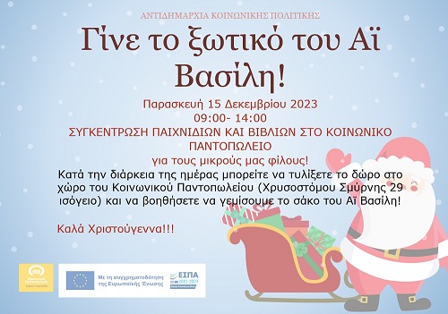 Την Παρασκευή 15 Δεκεμβρίου 2023 γινόμαστε όλοι «ξωτικά του Άγιου Βασίλη» συγκεντρώνοντας παιχνίδια και βιβλία στον χώρο του Κοινωνικού Παντοπωλείου(Χρυσοστόμου Σμύρνης 29 – Ισόγειο), από τις 09.00 έως τις 14.00.