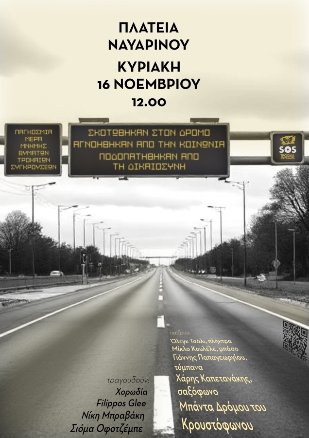 Tags: SOS Τροχαία ΕγκλήματαΆτομα με ΑναπηρίαΕγκλήματαΠαγκόσμια Ημέρα Μνήμης Θυμάτων Τροχαίων ΣυγκρούσεωνΤροχαίαΤΡΟΧΑΙΟ