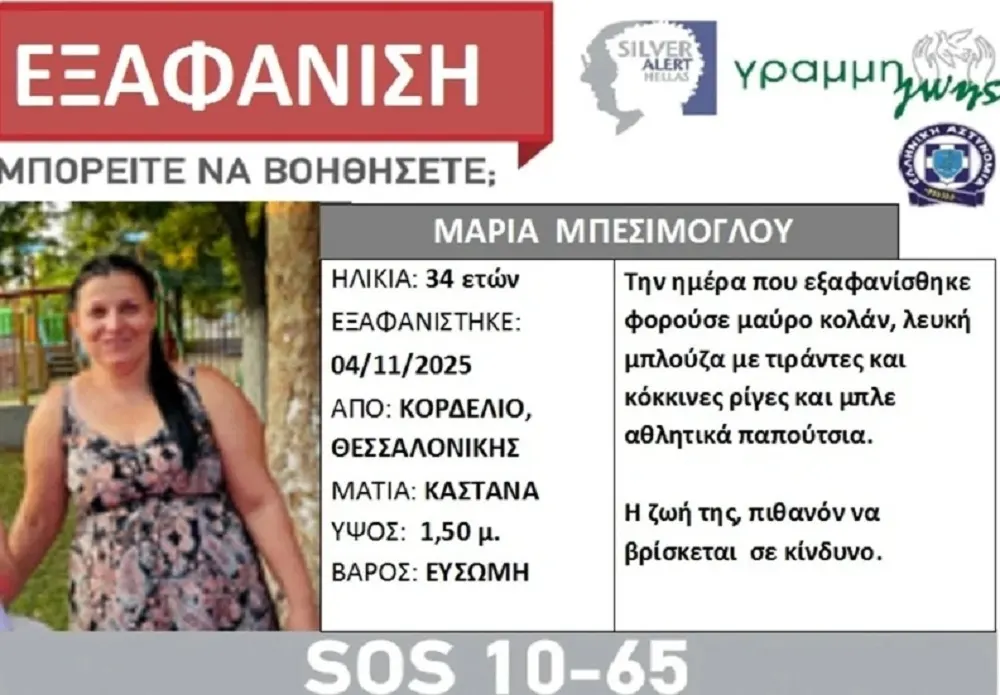 Πρόκειται για την 34χρονη Μαρία Μπεσιμόγλου, η οποία εξαφανίστηκε από το σπίτι της, στο Κορδελιό Θεσσαλονίκης, το πρωί της περασμένης Τρίτης 4 Νοεμβρίου, όταν έφυγε για να πάει στο φούρνο για να ψωνίσει.