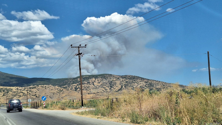 Συνεχίζει να καίει η φωτιά σε χαμηλή βλάστηση στην περιοχή Βαθύρεμα του δήμου Αγιάς στη Λάρισα.