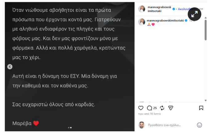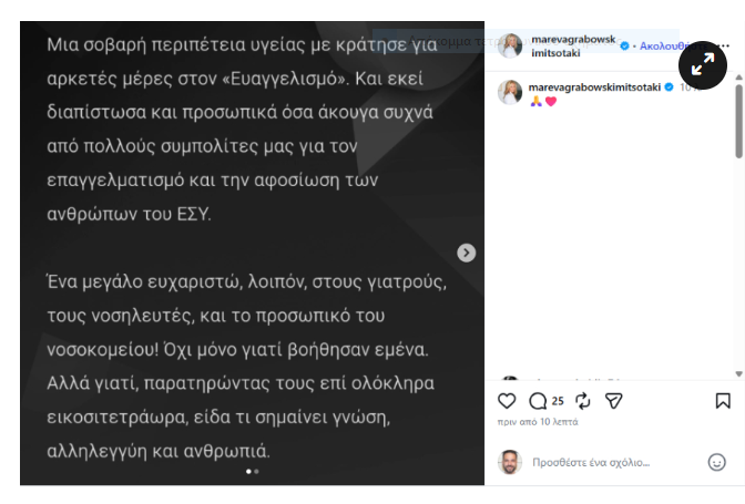 Κλείνοντας το μήνυμά της, ευχαρίστησε προσωπικά όλους όσοι τη φρόντισαν, γράφοντας πως στάθηκαν δίπλα της με επιστημονική επάρκεια αλλά και ανθρώπινη ζεστασιά σε μια δύσκολη στιγμή.
