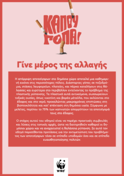Σύμφωνα με τα στοιχεία της WWF Ελλάς, στην Ελλάδα, ανά 100 μέτρα παραλίας υπάρχουν τουλάχιστον 50 αποτσίγαρα. Οι περισσότεροι καπνιστές δε γνωρίζουν ότι το αποτσίγαρο αποτελεί πλαστικό μιας χρήσης, και μάλιστα εξαιρετικά τοξικό για το φυσικό περιβάλλον και τη θαλάσσια ζωή και πως ό,τι καταναλώνεται από τα ψάρια και τα θαλασσινά, καταλήγει και στο δικό μας πιάτο…