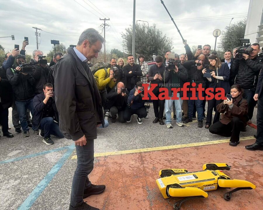 Το ρομπότ-σκύλος “Κύων” υποδέχτηκε τον Κυριακο Μητσοτακη στην είσοδο. Πρόκειται για ένα ρομπότ το οποίο μπορεί να συμμετέχει μεταξύ άλλων σε επιχειρήσεις απεγκλωβισμού ατόμων από φυσικές καταστροφές.