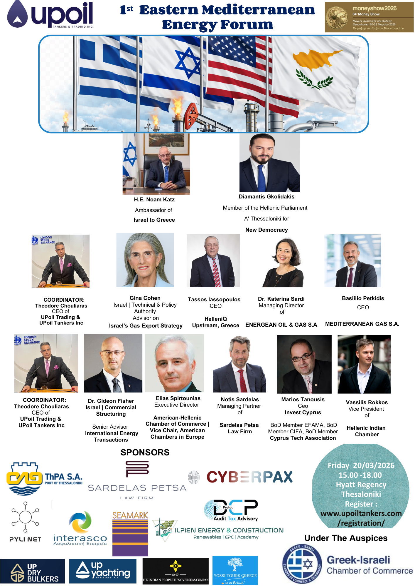 Στο πλαίσιο της διεθνούς οικονομικής διοργάνωσης Money Show 2026 Thessaloniki, η εταιρεία UPoilTankers & Trading LLC διοργανώνει το 1ο Φόρουμ Ενέργειας Βαλκανίων & Ανατολικής Μεσογείου, μια υψηλού επιπέδου συνάντηση ηγετικών προσωπικοτήτων του ενεργειακού και επιχειρηματικού κόσμου.