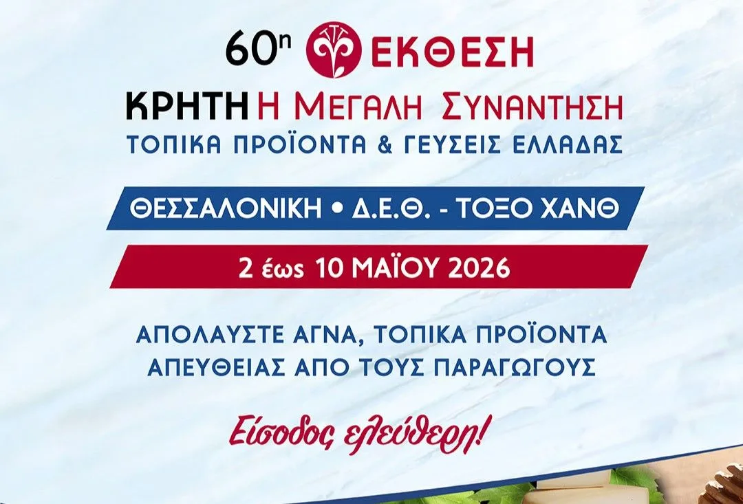 Η μεγάλη γιορτή της ελληνικής γαστρονομίας και παράδοσης επιστρέφει στην ανοιξιάτικη Θεσσαλονίκη, μέσα από την έκθεση–φεστιβάλ «Κρήτη: Η Μεγάλη Συνάντηση – Τοπικά προϊόντα και γεύσεις Ελλάδας», προσφέροντας στο κοινό μια αυθεντική εμπειρία γεμάτη αρώματα, γεύσεις και εικόνες από κάθε γωνιά της χώρας.