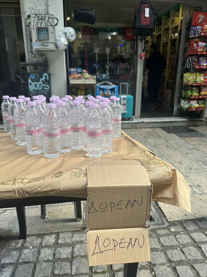 ανάρτηση χρήστη των social media οι ιδιοκτήτες του “παντοπωλείου των μεταναστών Αφγανών στην οδό Κλεισούρας” καθόλη τη διάρκεια της συγκέντρωσης “έβγαζαν συνέχεια νερά για τους διαδηλωτές που δεν χωρούσαν στην Αριστοτέλους” Μάλιστα όπως φαίνεται στη φωτογραφία τα νερά ήταν δωρεάν “Εγω όμως προσπάθησα να αφήσω 50 σεντς…
