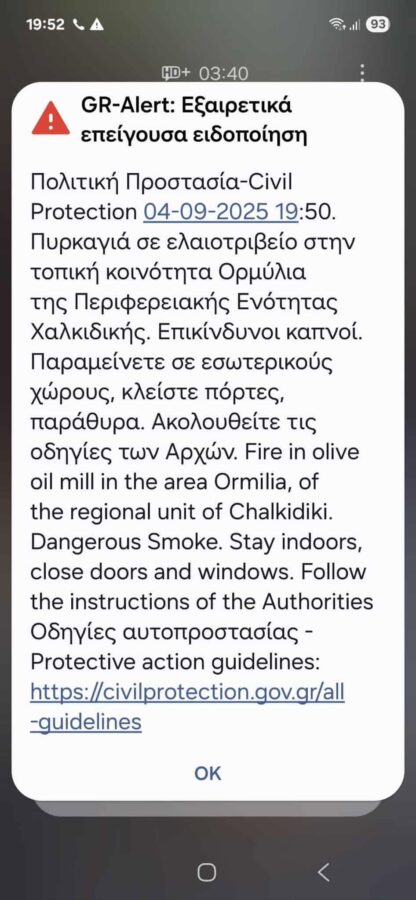 Στην περιοχή ήχησε το 112 με το μήνυμα της πολιτικής προστασίας να συστήνει στους πολίτες να παραμείνουν σε εσωτερικούς χώρους λόγω των καπνών, να κλείσουν τις πόρτες και τα παράθυρα και να ακολουθούν τις οδηγίες των αρχών.