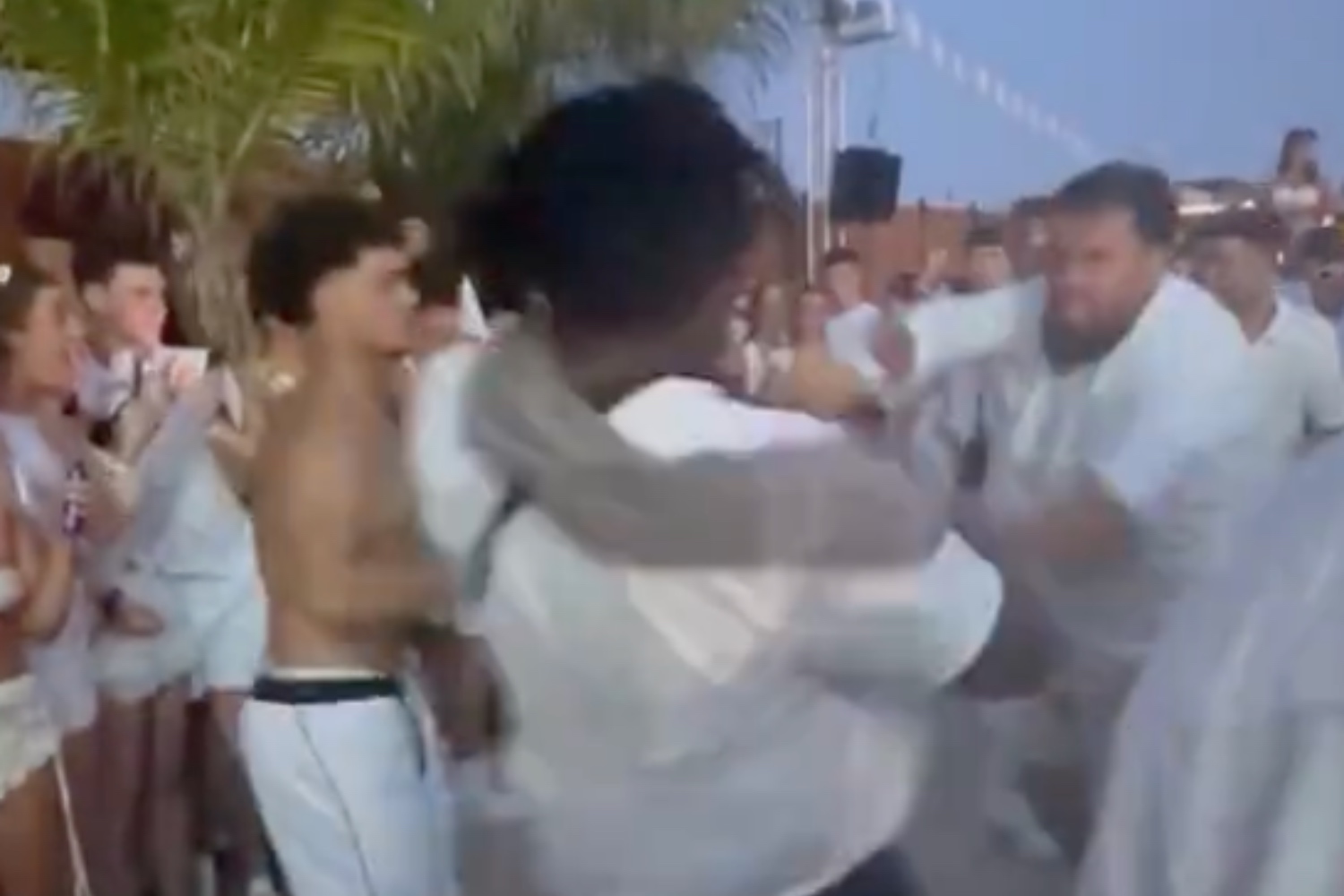 Σύμφωνα με βίντεο που δημοσίευσε η Daily Mail, δύο νεαροί άνδρες που φορούσαν λευκά σορτς συνεπλάκησαν με μια άλλη ομάδα, αποτελούμενη από μεγαλύτερους σε ηλικία άνδρες, επίσης ντυμένους στα λευκά.