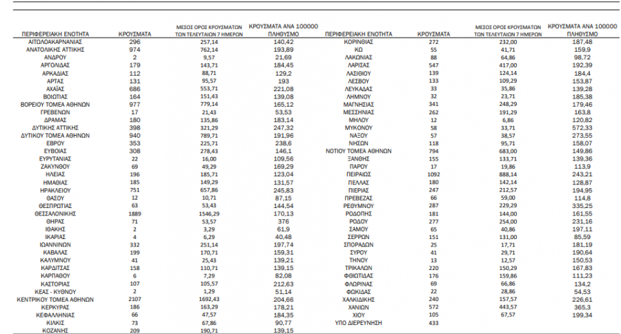 Με βάση τα επιβεβαιωμένα κρούσματα των τελευταίων 7 ημερών, 430 θεωρούνται σχετιζόμενα με ταξίδι από το εξωτερικό και 2.332 είναι σχετιζόμενα με ήδη γνωστό κρούσμα.