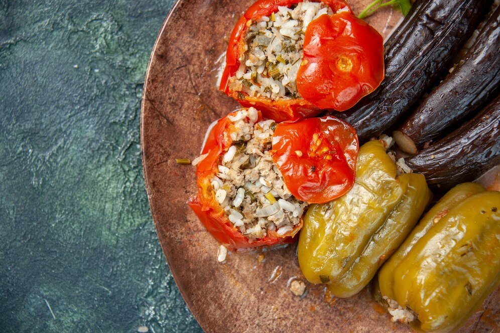 - Γεμιστά με ρύζι και λαχανικά: Ντομάτες και πιπεριές γεμιστές με ρύζι, μυρωδικά και φρέσκα λαχανικά, χωρίς χρήση λαδιού.