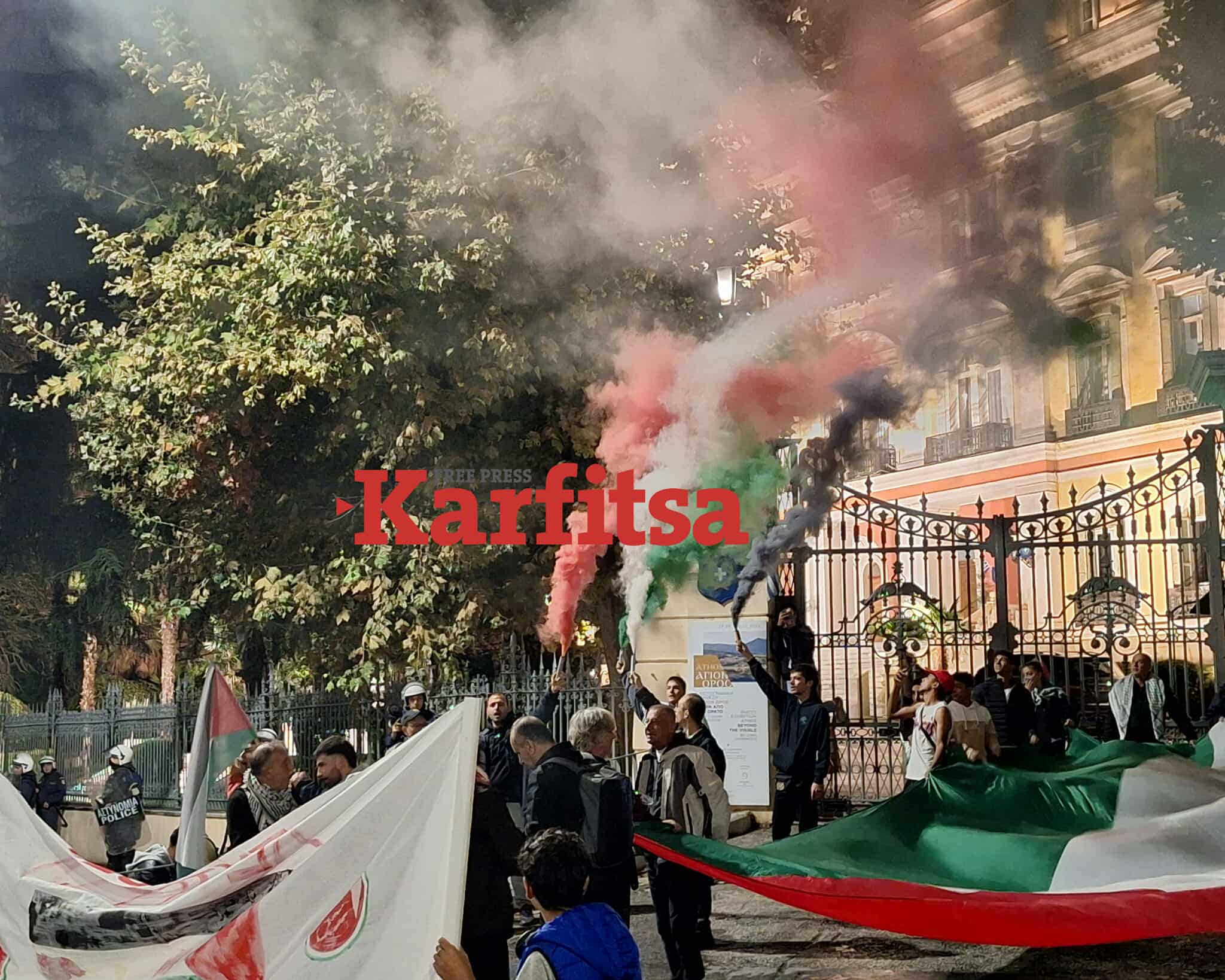 Οι διαδηλωτές με παλαιστινιακές σημαίες, πανό και συνθήματα που ζητούν να αφεθούν ελεύθερα τα μέλη της ελληνικής αποστολής έφτασαν έξω από το ΥΜΑΘ όπου άνοιξαν καπνογόνα στα χρώματα της Παλαιστίνης