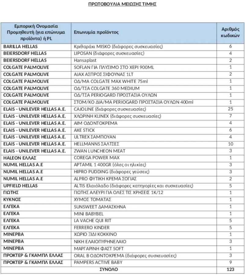 Η λίστα με τα 123 προϊόντα στην πρωτοβουλία μείωσης τιμής
