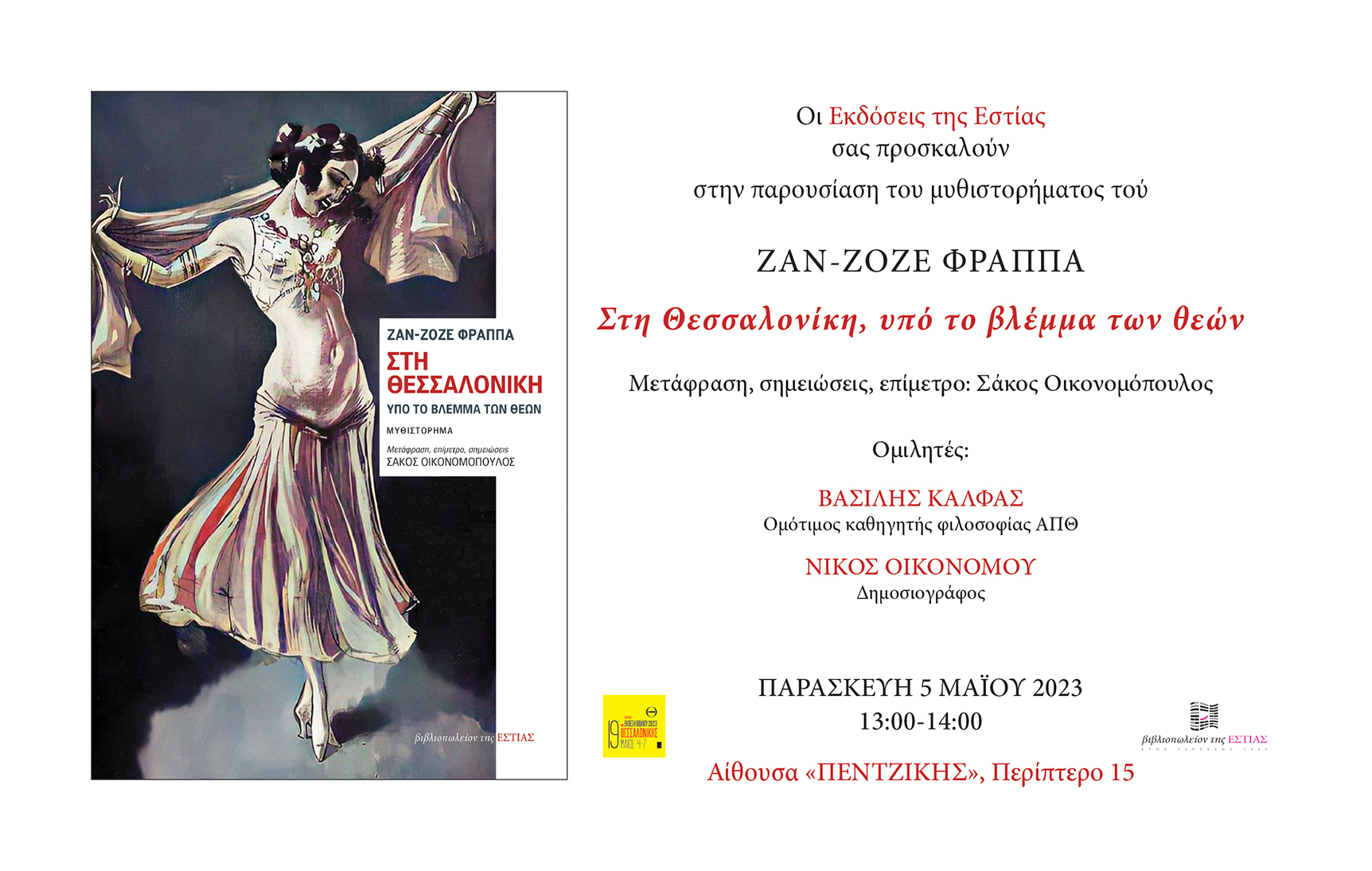 Το βιβλίο «Στη Θεσσαλονίκη, υπό το βλέμμα των θεών» κυκλοφορεί από τις Εκδόσεις της Εστίας και η παρουσίασή του θα γίνει στο πλαίσιο της Διεθνούς Έκθεσης Βιβλίου Θεσσαλονίκης την Παρασκευή 5 Μαΐου στις 13:00, στο Περίπτερο 15, στην αίθουσα «Πεντζίκης».