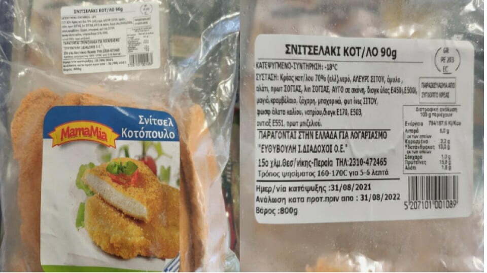 Ο Ε.Φ.Ε.Τ. και ειδικότερα η Περιφερειακή Διεύθυνση Κεντρικής Μακεδονίας, κατά τη διενέργεια ελέγχων στο πλαίσιο του Προγράμματος «Επίσημος Έλεγχος Μικροβιολογικών Κριτηρίων Ασφάλειας Τροφίμων» έτους 2021, προέβη σε δειγματοληψία προϊόντος με στοιχεία: «ΣΝΙΤΣΕΛ ΚΟΤΟΠΟΥΛΟ, Mama Mia, παρασκεύασμα από σύγκοπτο κρέας κοτόπουλου κατεψυγμένο», με την εμπορική ονομασία «ΣΝΙΤΣΕΛ ΚΟΤΟΠΟΥΛΟ, Mama Mia», που παρασκευάζεται από την επιχείρηση «ΕΛΛΗΝΙΚΕΣ ΝΟΣΤΙΜΙΕΣ Α.Ε.» για λογαριασμό της «Ι. ΕΥΘΥΒΟΥΛΗ ΔΙΑΔΟΧΟΙ Ο.Ε.». βάρους 800γρ., με ημερομηνία κατάψυξης:31/08/2021 και ημερομηνία ανάλωσης κατά προτίμηση πριν από: 31/08/2022. Το προϊόν εξετάστηκε από , και σε συνεργασία με το Εργαστήριο Δοκιμών και Ερευνών Τροφίμων Θεσσαλονίκης του ΕΦΕΤ και διαπιστώθηκε η παρουσία του παθογόνου μικροοργανισμού Salmonella spp. στο ανωτέρω δείγμα.
