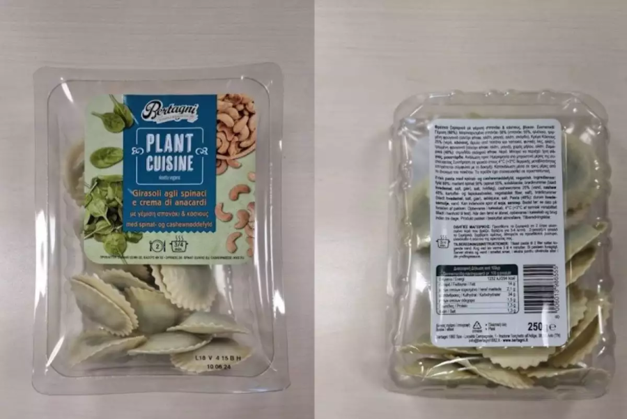 Σύμφωνα με την ανακοίνωση ανάκλησης από τον ΕΦΕΤ, πρόκειται για το προϊόν με ξενόγλωσση ονομασία πώλησης «Girasoli vegani spinaci e anacardi 250×6» και εμπορική ονομασία «Bertagni Plant Cuisine».