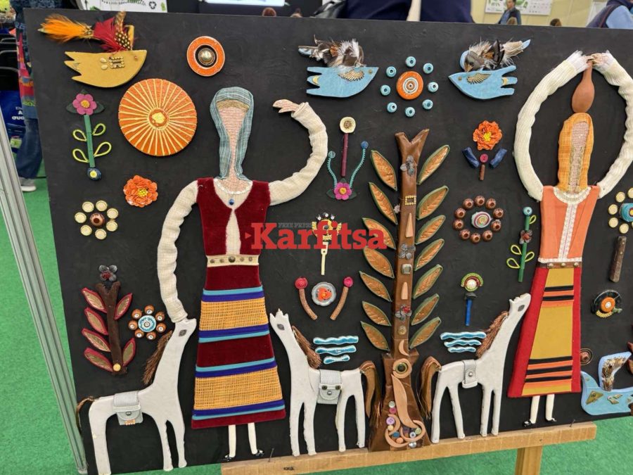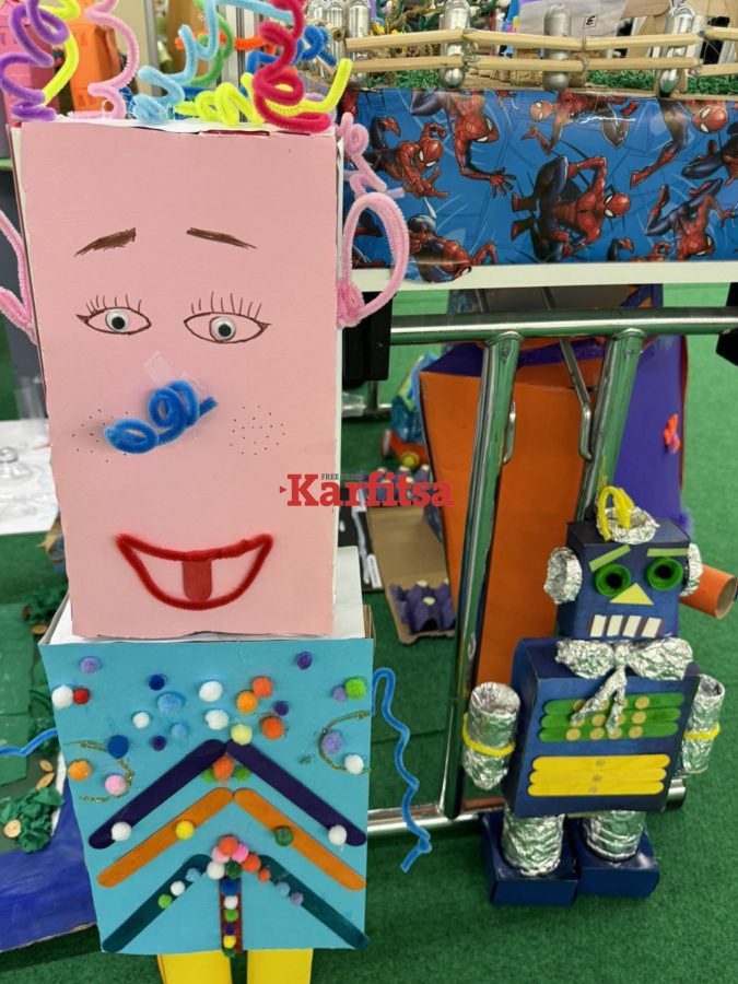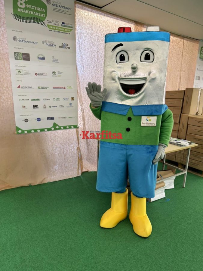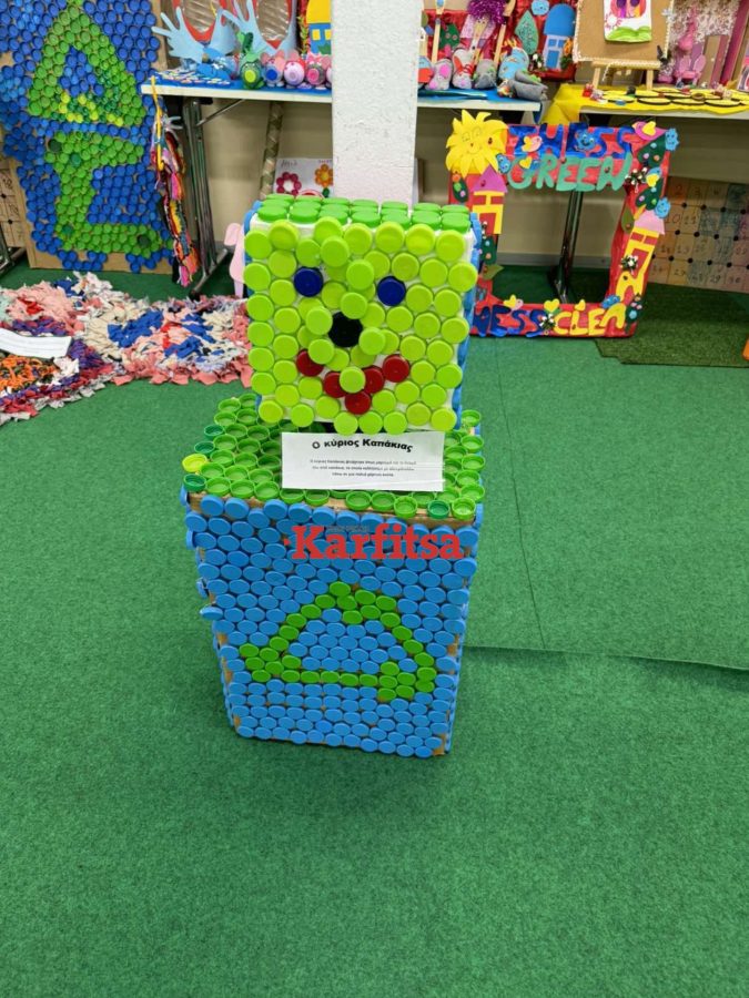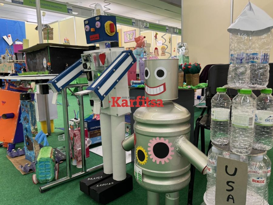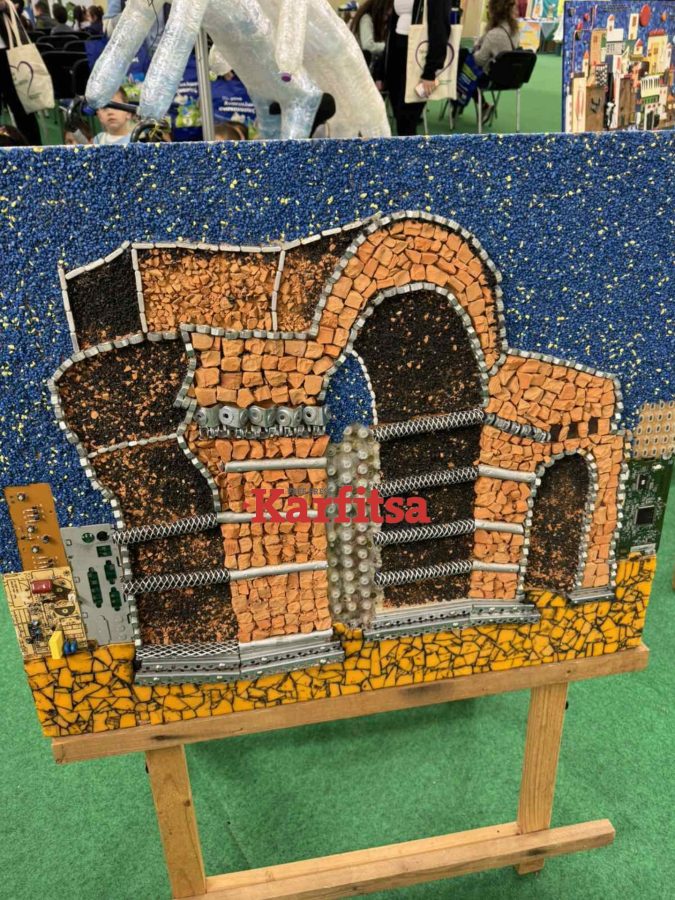 Τα βλέμματα «κλέβουν» οι κατασκευές και τα έργα τέχνης που είναι φτιαγμένα από πλαστικό, αλουμίνιο και χαρτί. Τους μαθητές και τις μαθήτριες υποδέχεται στην είσοδο του περιπτέρου μια μασκότ – μπαταρία που τους ενημερώνει για θέματα του περιβάλλοντος.