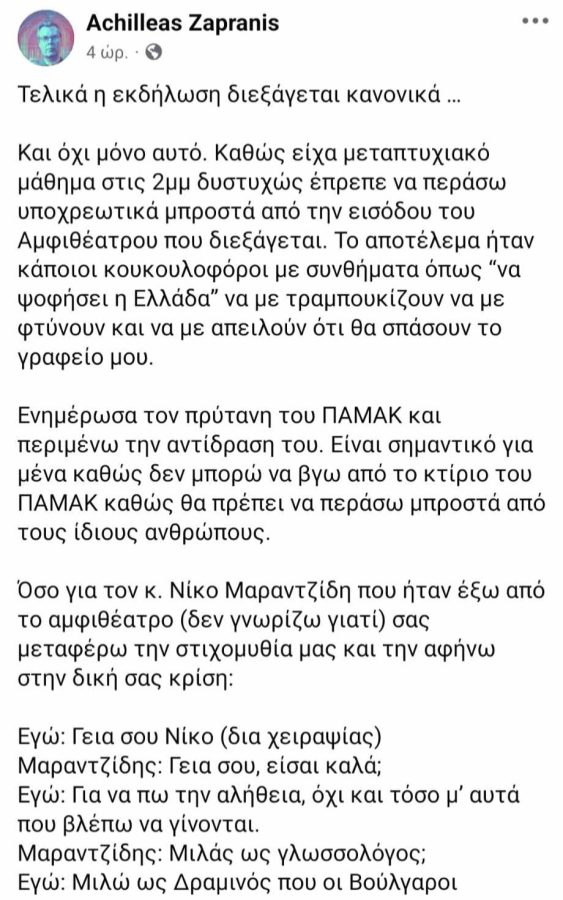 «Καταδικάζουμε με τον πλέον κατηγορηματικό τρόπο την απρόκλητη επίθεση σε βάρος του π. Πρύτανη του ΠΑΜΑΚ Αχιλλέα Ζαπράνη έξω από το Αμφιθέατρο που φιλοξενήθηκε ημερίδα Εργαστηρίου του Τμήματος Βαλκανικών, Σλαβικών και Ανατολικών Σπουδών.
