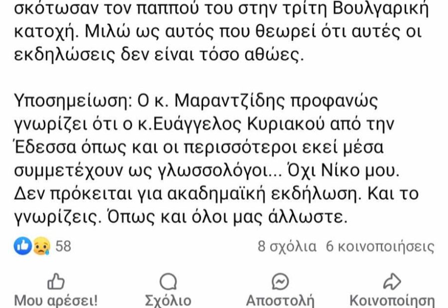 Υποσημείωση: Ο κ. Μαραντζίδης προφανώς γνωρίζει ότι ο κ. Ευάγγελος Κυριακού από την Έδεσσα όπως και οι περισσότεροι εκεί μέσα συμμετέχουν ως γλωσσολόγοι… Όχι Νίκο μου. Δεν πρόκειται για ακαδημαϊκή εκδήλωση. Και το γνωρίζεις. Όπως και όλοι μας άλλωστε.