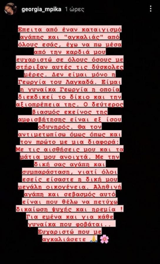 «Έπειτα από έναν καταιγισμό αγάπης και αγκαλιάς από όλους εσάς, έχω να πω μέσα από την καρδιά μου ευχαριστώ σε όλους όσους με στήριξαν αυτές τις δύσκολες μέρες.